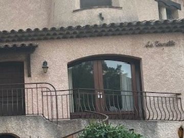 Large open plan lounge area with 2x double opening doors to enclosed walled garden and double sliding doors to Juliette balcony overlooking main square. The lounge area has a large double foldout bed with storage . A dining table and additional seating with Large TV